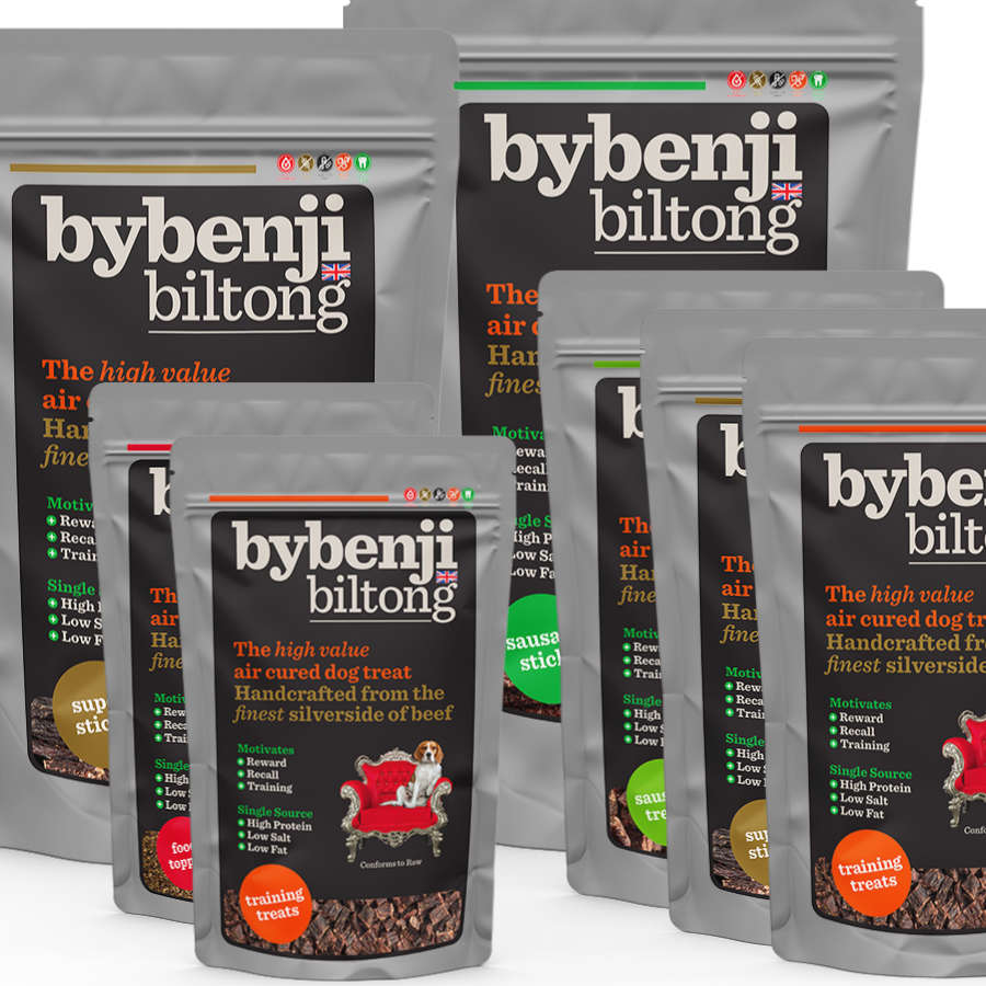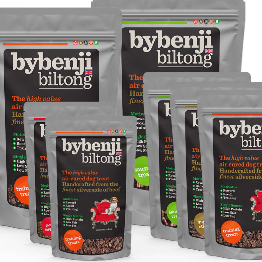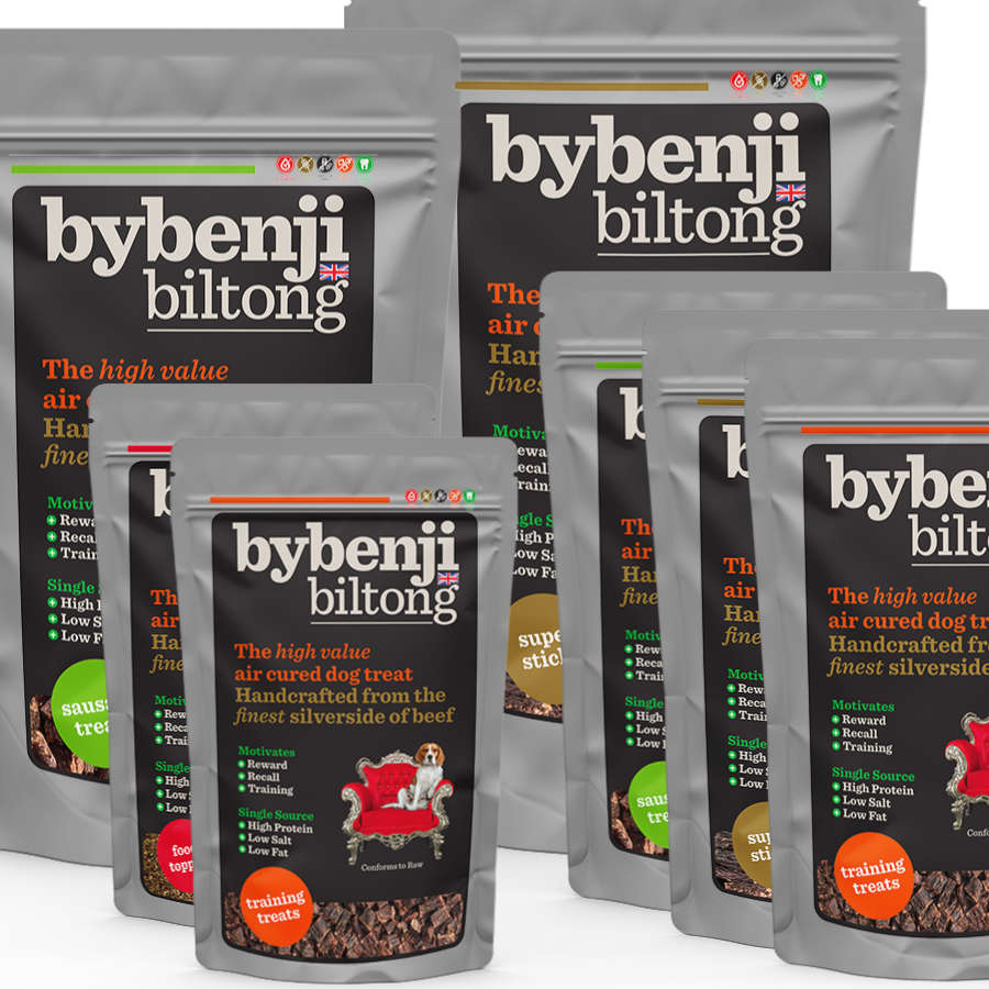 ContentYes, you have found the Biltong Bundle of all Biltong Bundles, a ByBenji Paradise and Biltong Addicts heaven! With a variety of bag sized and pocket pouches to decant your larger bags into, this is the ultimate in treat time packages. All our products can be frozen pre or post opening and all our bags are reusable and resealable, the combination of bag sizes means that every occasion from walking to training is catered for. Benefits of a bigger bundle are not only for your dog, along with FREE postage the saving made is also comparable with ordering at least an extra bag, no better way to avert that Biltong emergency!If your dog just can’t get enough , then what else can you do but stock up. All our products can be frozen pre or post opening and all our bags are reusable and resealable, the combination of bag sizes means that every occasion from walking to training is catered for. Benefits of a bundle are not only for your dog, the saving made is comparable with ordering an extra bag, no better way to avert that Biltong emergency! Multi dog households will enjoy the variety , and why not share the experience by sending as a gift. Bundles of biltong means bundle of treat time fun, as no gathering is complete without a biltong treat!